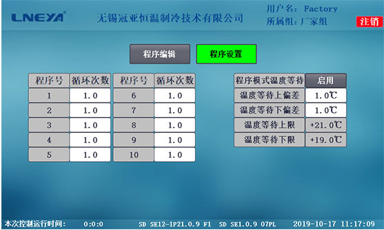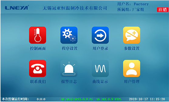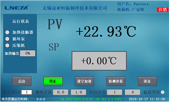 控制畫面,設(shè)置控溫參數(shù),查看實時溫度,同時可以檢測查看制冷機組、加熱器、循環(huán)泵工作狀態(tài),當(dāng)前的溫度控制模式,解熱排空的狀態(tài)