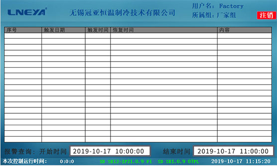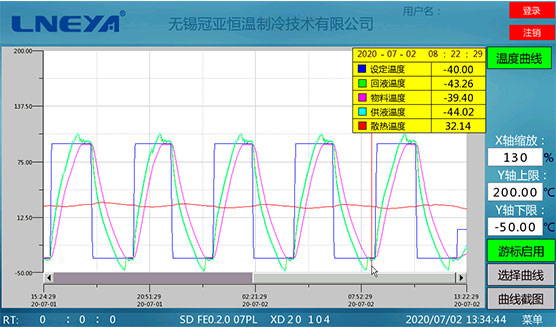 清晰曲線顯示,曲線包含設(shè)定溫度、供回液溫度、物料溫度及散熱溫度,可自由選擇是否顯示。同時對溫度的上限和下限進行設(shè)置,支持曲線截圖保存